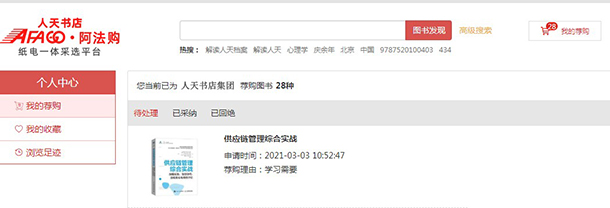 4、我的荐购:【个人中心】→【我的荐购】 中可查看到所有的荐购书目,及图书馆的采纳情况。
