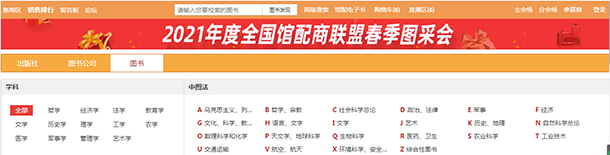 2.1、出版社分会场:按出版社综合分类和出版公司名称展示各出版社图书,点击分类首先展示该类别下的出版社名单,点击出版社名称即可进入选书界面。