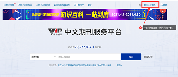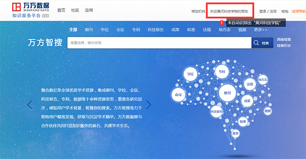 万方、维普及外文数据库界面的右上角未能自动识别出“黄河科技学院”
