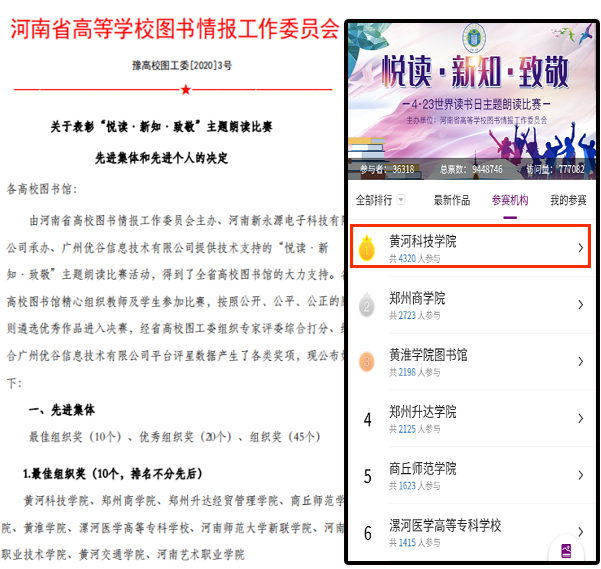 由河南省高校图书情报工作委员会举办的“悦读 . 新知 . 致敬” 主题朗读比赛,旨在诵读经典,讴歌伟大新时代和疫情之下逆行者的英雄们。全国高校共有36318名选手报名参赛,我校参赛人数 4320,作品数量4958篇,均居全国第一。我校教师席宇衡、李保骞获得教师组三等奖,朱英淑、吴洁、苗作云等7位教师获得优秀奖。学生组王俊、成博同学获得二等奖,赵志铭等40名同学获得优秀奖,韩鸽鸽同学获得网络人气奖。石拓、唐玲两位老师获得最佳优秀指导教师奖。