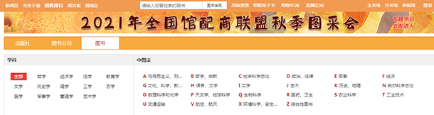 2.1、出版社分会场:按出版社综合分类和出版公司名称展示各出版社图书,点击分类首先展示该类别下的出版社名单,点击出版社名称即可进入选书界面。