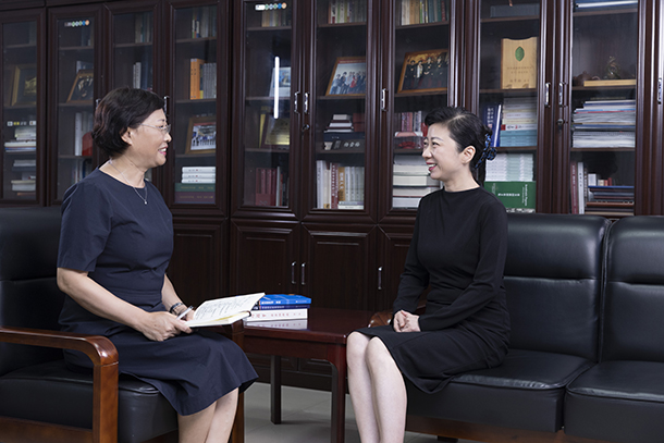 图1 黄河科技学院杨雪梅校长(右)在校长办公室接受丁富云馆长(左)的采访