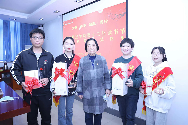 校领导分别为荣获读书达人、《百部经典》书评一等奖、阅读推广突出贡献奖、阅读推广优秀志愿者、读者之星等荣誉的16名师生代表颁发奖杯、奖品,与获奖者合影留念,在所奖图书上为大家一一签字赠言。