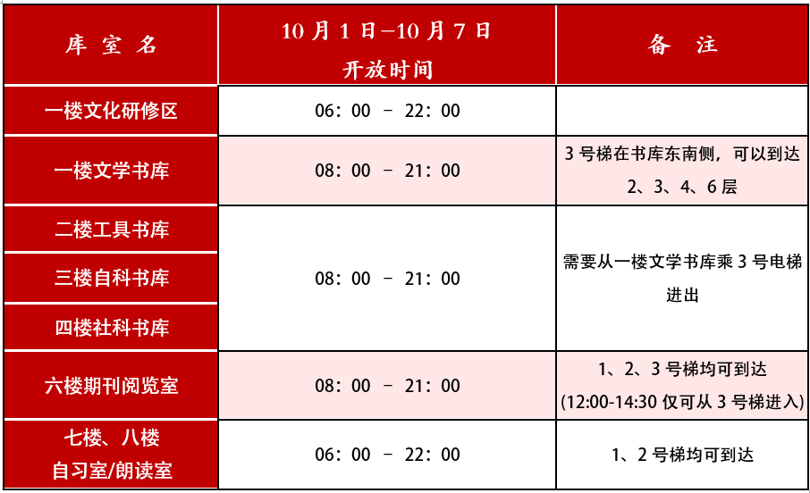 为了满足广大师生教学与科研需求,更好的服务于我校师生,图书馆十一国庆假期期间一楼文化研修区及文学书库、二楼工具书库、三楼自科书库、四楼社科书库、六楼期刊阅览室、七楼自习室、八楼自修室/朗读室正常开放,欢迎广大读者假期期间来馆学习。具体开放时间如下: