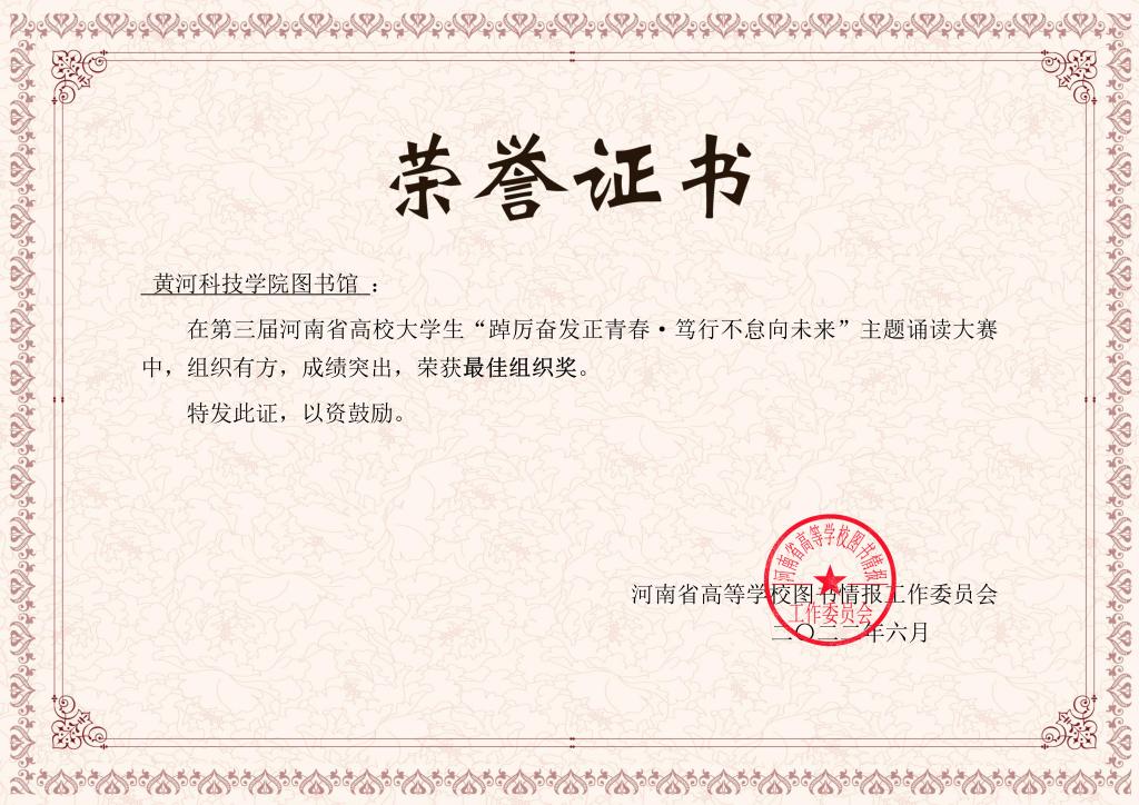 近日,由河南省教育厅高等教育处指导、河南省高等学校图书情报工作委员会主办的第三届河南高校大学生“踔厉奋发正青春·笃行不怠向未来”主题诵读大赛圆满落幕。该活动于4月份开启,我校2222名学生报名参赛,共有二千余个作品参赛,历经初赛、校内评选、省级决赛几个阶段的评比,黄河科技学院在七个项目中斩获6个奖项,我校图书馆荣获河南省“最佳组织奖”荣誉称号。