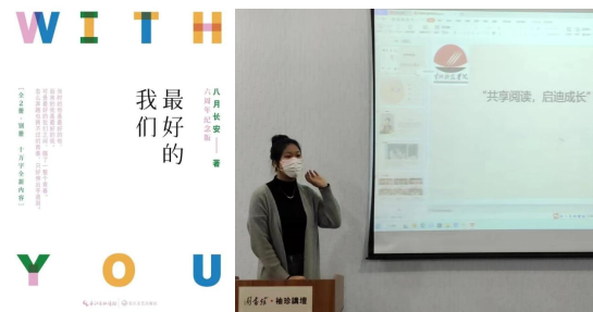 个人感悟:这本书虽然很有名气,但在分享的过程中我们发现并没有很多同学看过这本书。蔡梦瑶同学告诉大家,这本书中讲到的问题让人感到触目惊心,有强奸、种族歧视等等,但作者仍不失优雅与幽默从一个孩子的视角揭露这残酷的现实。更让我动容的是作者对于自己的自信,她在面对别人的质疑时,勇敢的讲出“有这一本就够了,哪还需要其它的呢?”也许我们都是一个怪人,热烈的爱着这个不尽如人意的世界。