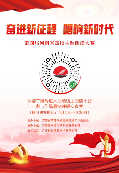 为深入贯彻落实习近平新时代中国特色社会主义思想,践行党的 二十大精神,不忘初心、牢记使命,踔厉奋发、勇毅前行,开展读书活动,建设书香社会。在第28个“世界读书日”(4月23日)来临之际,河南省高等学校图书情报工作委员会举办第四届河南省高校 “奋进新征程·唱响新时代”主题诵读大赛。