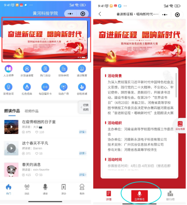 1、参与者扫描下方海报上二维码或关注“黄科大图书馆”微信公众号,点击下拉菜单【阅读推广】→【读者活动】→【主题朗诵】,进入活动页面,报名参与。