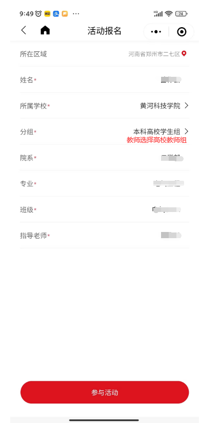 3、填写报名信息:根据活动界面要求填写真实的报名信息,请准确选择“黄河科技学院”。