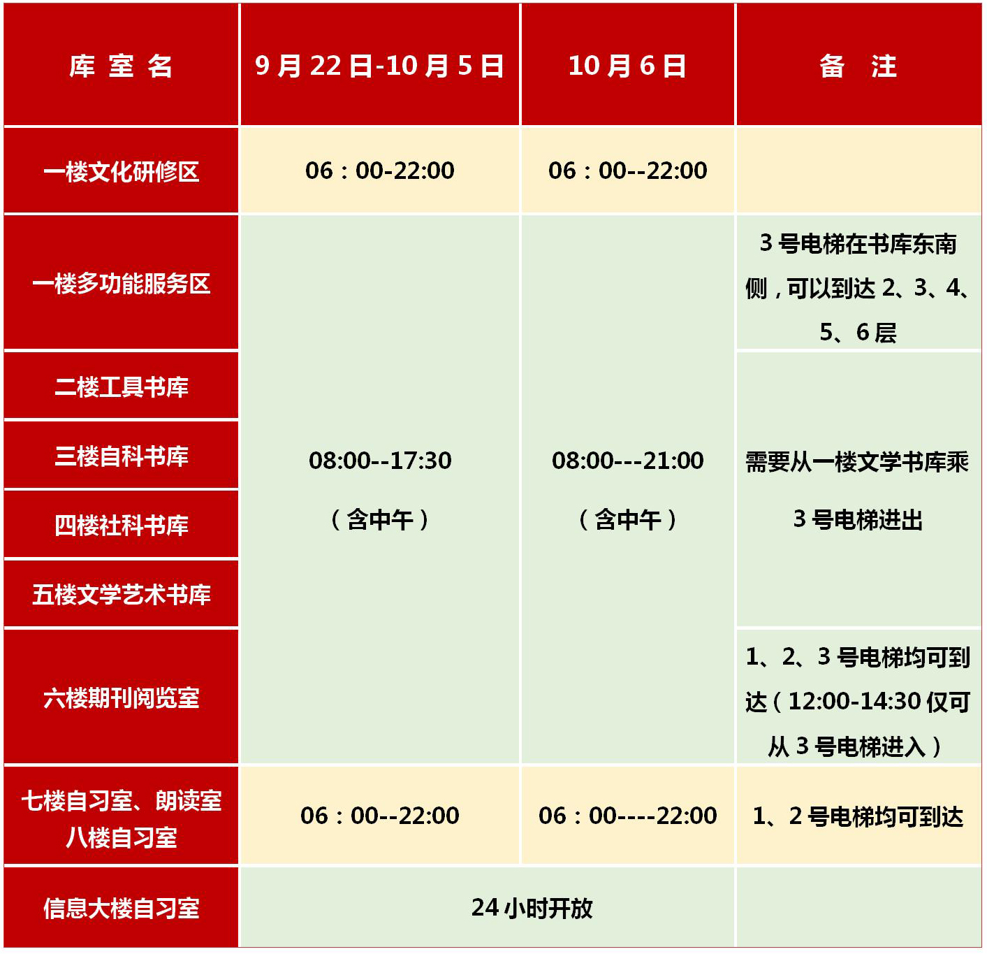 为了满足广大师生教学及科研需求,更好的服务于我校师生,图书馆将于国庆节假期期间照常开放,具体开放安排如下:
