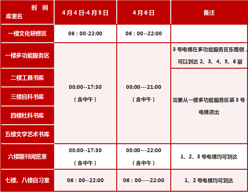 为了满足广大师生教学及科研需求,更好的服务于我校师生,图书馆将于清明假期期间照常开放,具体开放安排如下: