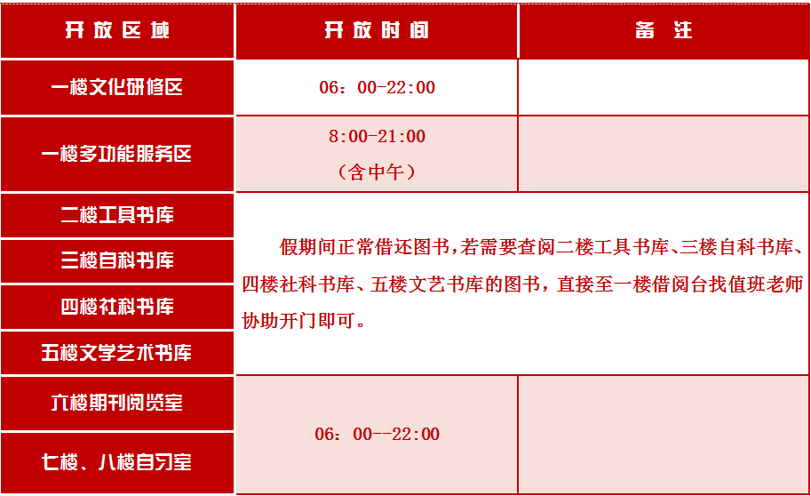 为有效保障我校师生假期间的学习与教研,图书馆将于国庆节假期期间照常开放,具体开放安排如下: