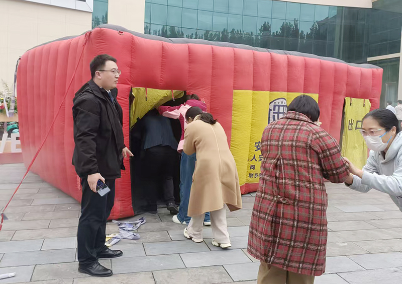 活动现场还利用消防逃生帐篷模拟现场真实的火灾,帐篷内采取火灾烟雾模拟。李林峰教员为大家详细介绍了消防逃生帐篷的正确使用方法,训练在烟雾环境中寻找安全出口,培养师生在紧急情况下的自救和互救能力。在场教职工及学生有序地进入消防烟雾逃生体验仓,通过体验,切实锻炼了大家应对突发火灾的应急反应能力和逃生技能。