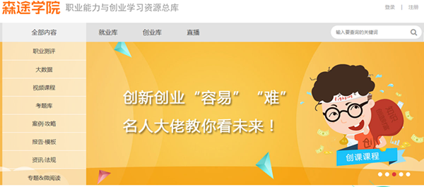 《森途学院》按照职业创业发展路径,整合视频、数据、资讯、法律法规、案例、文书、报告、题库等各类优质资源,同时提供在线测评、模拟演练等服务,为高校的就业创业教育提供提供整体化解决方案。围绕学生就业、创业、职场、考证、综合素质等方面优化设置,按照用户自主学习以及引导式学习两种学习进行设置网站结构,并结合图书馆特有的资源内容展示方式,使其更全面、更便捷、更高效。