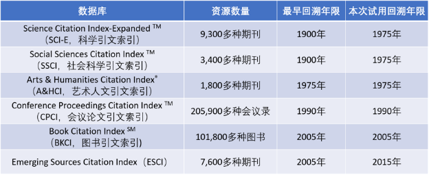 Web of Science核心合集的构成、资源数量及其回溯深度: