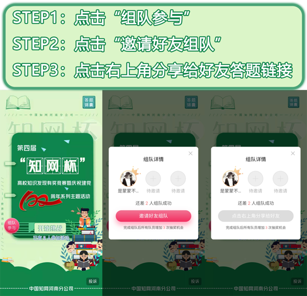 在活动开始页面,点击"组队参与",邀请2位未参赛的小伙伴进行组队答题,组队成功后,队内每位成员即可额外获得3次抽奖机会。