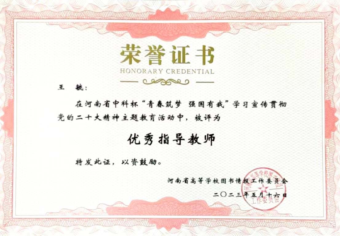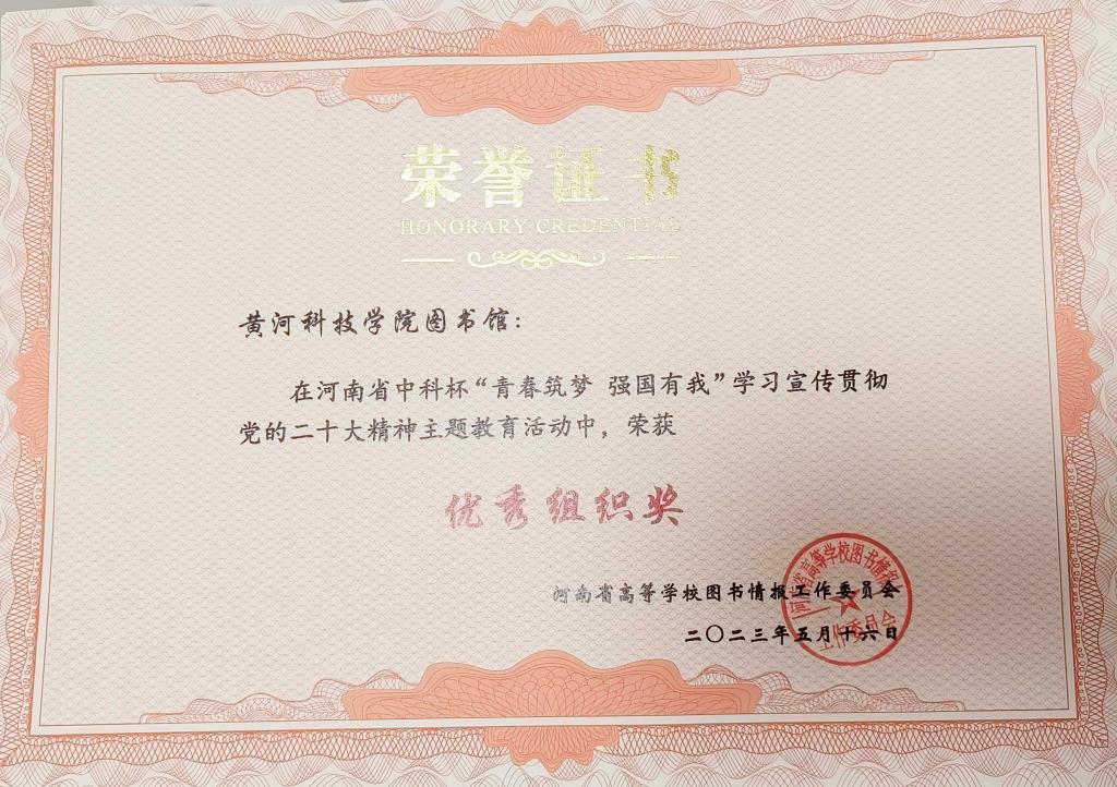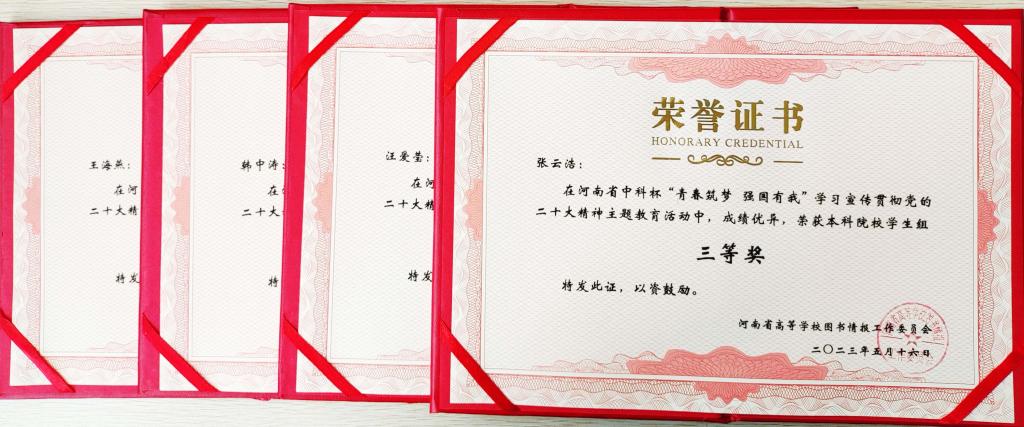 为深入学习宣传贯彻党的二十大精神,贯彻落实习近平总书记关于青年工作的重要思想,弘扬伟大建党精神,全面落实立德树人根本任务,引领广大师生深刻领悟“两个确立”的决定性意义,增强“四个意识”、坚定“四个自信”、做到“两个维护”,厚植家国情怀、涵养进取品格,激发起建功新时代的信心决心。在河南省教育厅高等教育处的指导下,由河南省高等学校图书情报工作委员会主办,图书馆和马克思主义学院共同组织参加了河南省中科杯“青春筑梦 强国有我” 学习宣传贯彻党的二十大精神主题教育活动。
