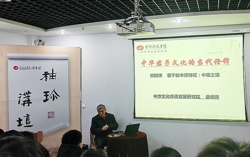 11月30日,图书馆袖珍讲坛系列“君子文化”系列讲座第四期顺利开讲,本期讲座以“君子的本质特征:中庸之道”为主题,由我校中华文化传承发展研究院副院长岳德常教授主讲,70余名同学参加。