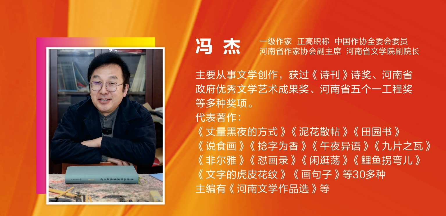 嘉宾介绍:一级作家、中国作协全委会委员、河南省作家协会副主席、河南省文学院副院长。主要从事文学创作,获过《诗刊》诗奖、河南省政府优秀文学艺术成果奖、河南省五个一工程奖等多种奖项。代表著作有《丈量黑夜的方式》《泥花散帖》《田园书》《说食画》《捻字为香》《午夜异语》《九片之瓦》《非尔雅》《怼画录》《闲逛荡》《鲤鱼拐弯儿》《文字的虎皮花纹》《画句子》等30多种;主编有《河南文学作品选》等。