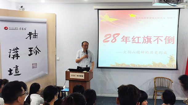 5月26日,图书馆举办大别山精神专题讲座。邀请中共河南省委党史研究室原副主任、河南省中共党史学会副会长、我校中原学研究院研究员郭晓平,做题为《28年红旗不倒——大别山精神的历史形成》的报告。活动由图书馆党支部书记丁富云主持,校产管理处党支部书记于春霞等机关第四党总支的党员和部分优秀学生代表聆听了讲座。