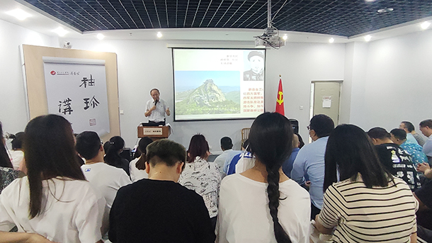 一曲《八月桂花遍地开》拉开讲座序幕,郭晓平用质朴的语言、丰富的史料,回顾了大别山早期建党,在经历土地革命战争、抗日战争、解放战争,最后迎来革命胜利曙光的历程,并以大量鲜活的革命人物和英雄事迹,对大别山精神的历史形成及核心内容做了深刻阐释。他说,大别山28年红旗不倒的历史奇迹是大别山人民在极其艰苦的环境下,坚守在大别山、奋斗在大别山,革命到底、矢志不渝,以悲壮的牺牲赢得苦难辉煌的过程。“坚守信念、胸怀全局、团结奋进、勇当先锋”的大别山精神,是大别山人民在中国共产党的领导下创造的,它是我们党宝贵的精神财富。