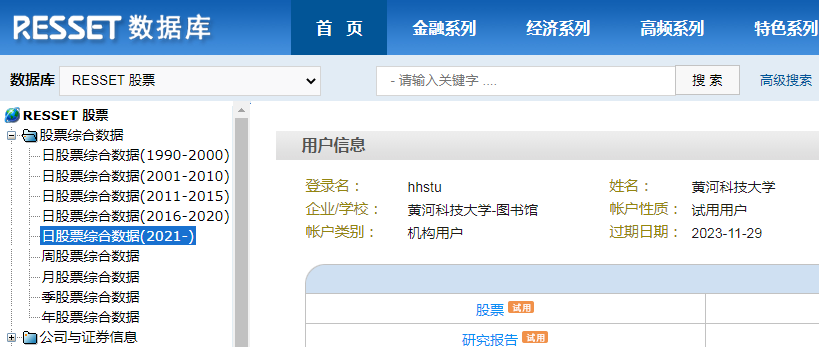 RESSET金融研究数据库:数据库历史数据完整、涵盖广泛,包括股票、债券、基金、研究报告、融资融券、宏观统计、行业统计、金融统计、外汇、期货、黄金等,并且研发团队与国内外著名高校合作计算了丰富的衍生指标。充分参照国际著名数据库的设计标准,又结合中国金融市场的实际情况,以实证研究为导向整体设计而成。为模型检验、投资研究、实证研究、学科与实验室建设等提供专业服务的数据平台。