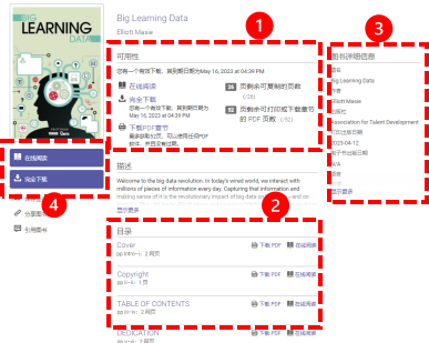 3、图书详情页面:可查看①图书可下载、可复制的页数,②目录,③详细信息,④直接在线阅读或整本下载