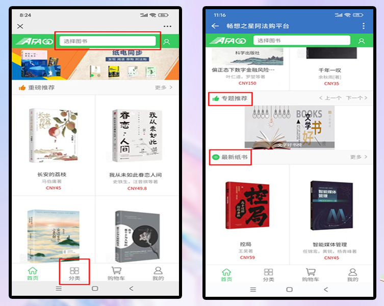 2、通过直接检索、分类查找、专题推荐、最新纸书专栏等方式找到所需图书。